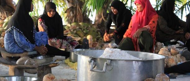 Faafu Atoll is composed of 23 islands with a population of about 4,600 inhabitants. According to the 2006 census data (more recent data is still under revision), Magoodhoo’s population amounts to 683 residents distributed on a limited surface (approximately 900 meters by 400 meters) and mostly concentrated in the island village. Since a large portion of the male residents are employed in activities such as fishing away from the island, sometimes for long periods, the female inhabitants represent the majority of the resident population in Magoodhoo. Besides housework, women are involved in a series of activities for their families and community: agricultural community planning, management of public spaces, preschool activities, organization of public events, conservation and repairing of fishing nets, and the production of handcrafts to be sold in the resorts (for example palm leaves are used to make roof mats).